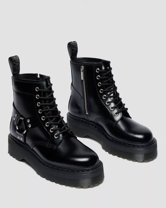 Strapped in but unrestrained. The 1460 Quad Harness 8-eye boot armors up in contrast hardware on high-gloss black leather. Known for its smooth finish and strong wax coat, Analine leather is a force of durability. Decorated with silver eyelets and harness detailing, other features are dialed down in subtle monochrome: a black and gunmetal heel loop, black welt stitching and black Quad sole for greater height – and impact.