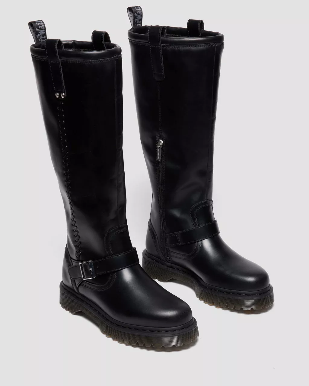Taller, smoother and just as rugged. The Anistone Knee High biker boot has a more refined look but doesn’t forget its roots. Renewed in Orleans leather which has a polished finish. We added more height but stayed true to all of the fan favorite Anistone features: silver hardware in the form of a brass buckle and cross rivet branding. And whipstitch detailing that cascades down the boot. Along with signature DM’s finishes, including our scripted heel loop and yellow welt stitching. The silhouette stands on a smoke Bex sole for extra height.