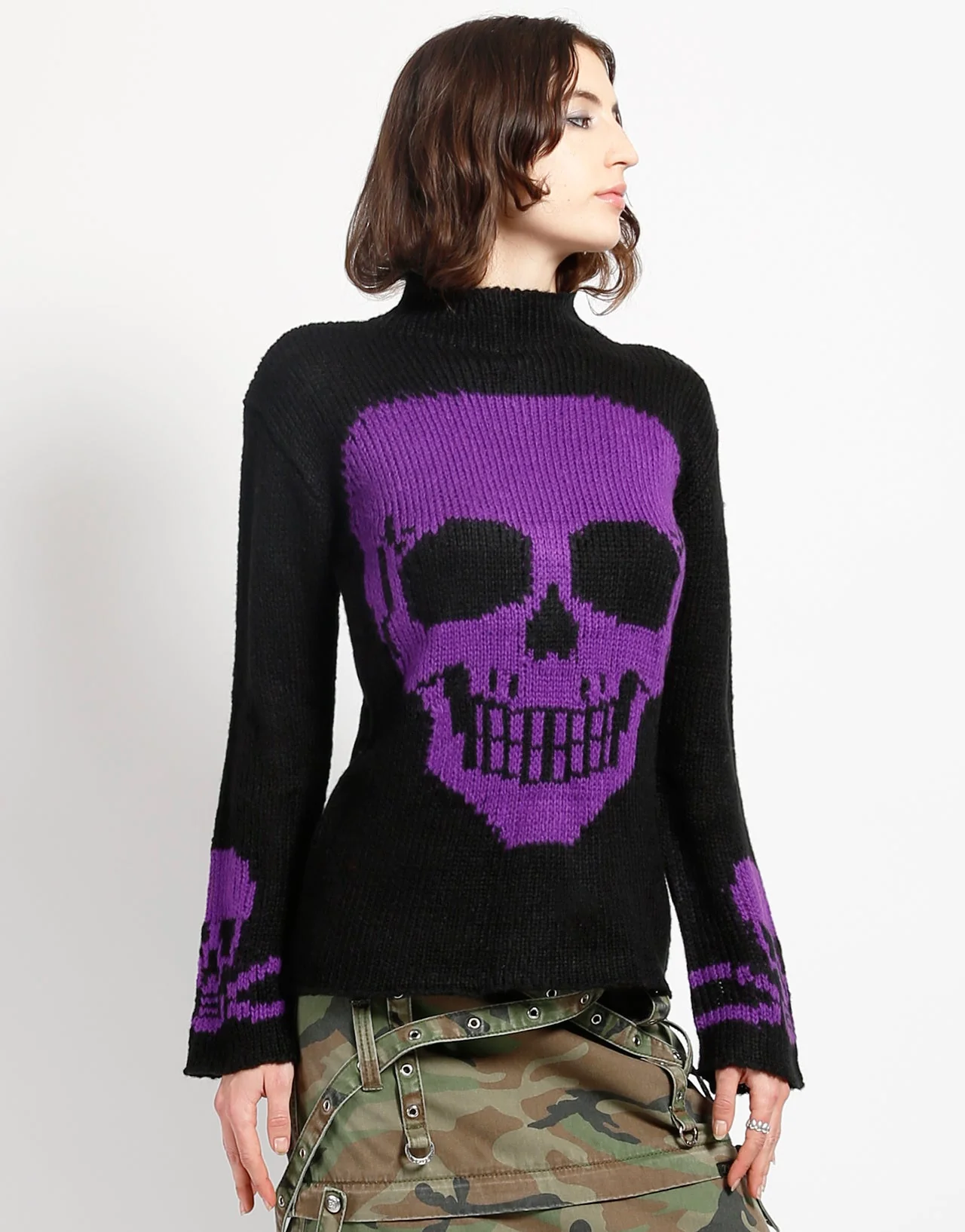This slinky acrylic knit sweater features a purple skull on the front, two tiny skulls on the long sleeves and loose construction, which means it looks perfectly lived in before you even put it on!